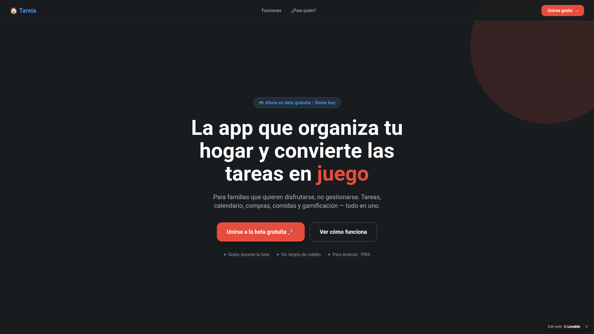 Tareia es una aplicación web progresiva (PWA) para la gestión colaborativa del hogar y la familia. Permite coordinar tareas, planificar comidas, gestionar compras, organizar eventos y fomentar la colaboración familiar mediante un sistema de gamificación.