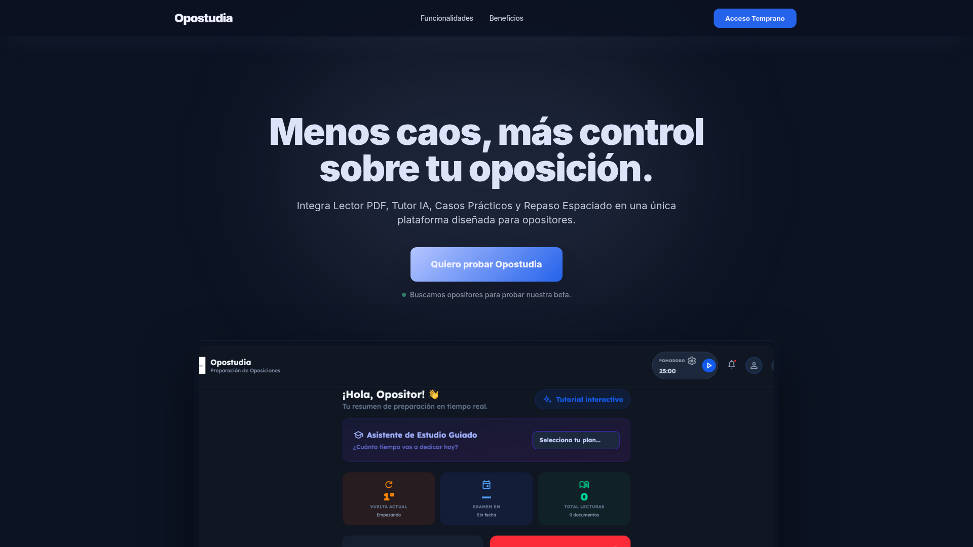 Opostudia resuelve el absoluto caos de la preparación de exámenes de alto rendimiento unificando todas las herramientas en un solo flujo de trabajo potenciado por Inteligencia Artificial. No es un chatbot más; es un sistema de estudio RAG interactivo. Permite al usuario conectar su Google Drive y abrir sus PDFs originales en la plataforma para subrayarlos directamente. Mientras lee, la IA (Gemini) actúa como tutor contextual (aplicando el modelo de Feynman, creando reglas mnemotécnicas e in